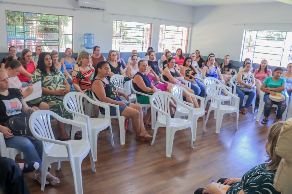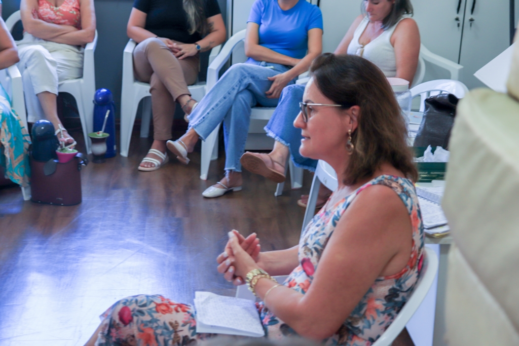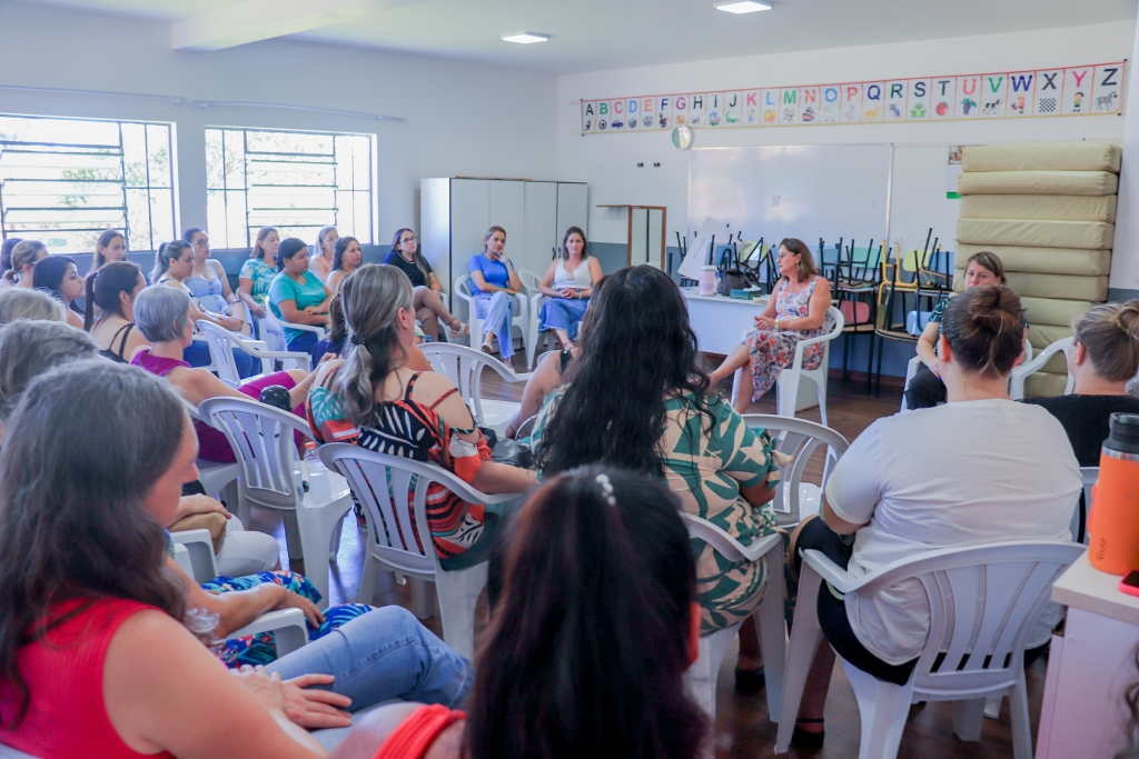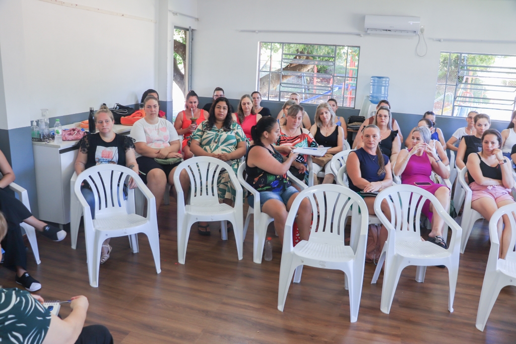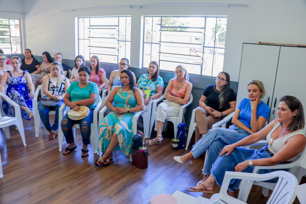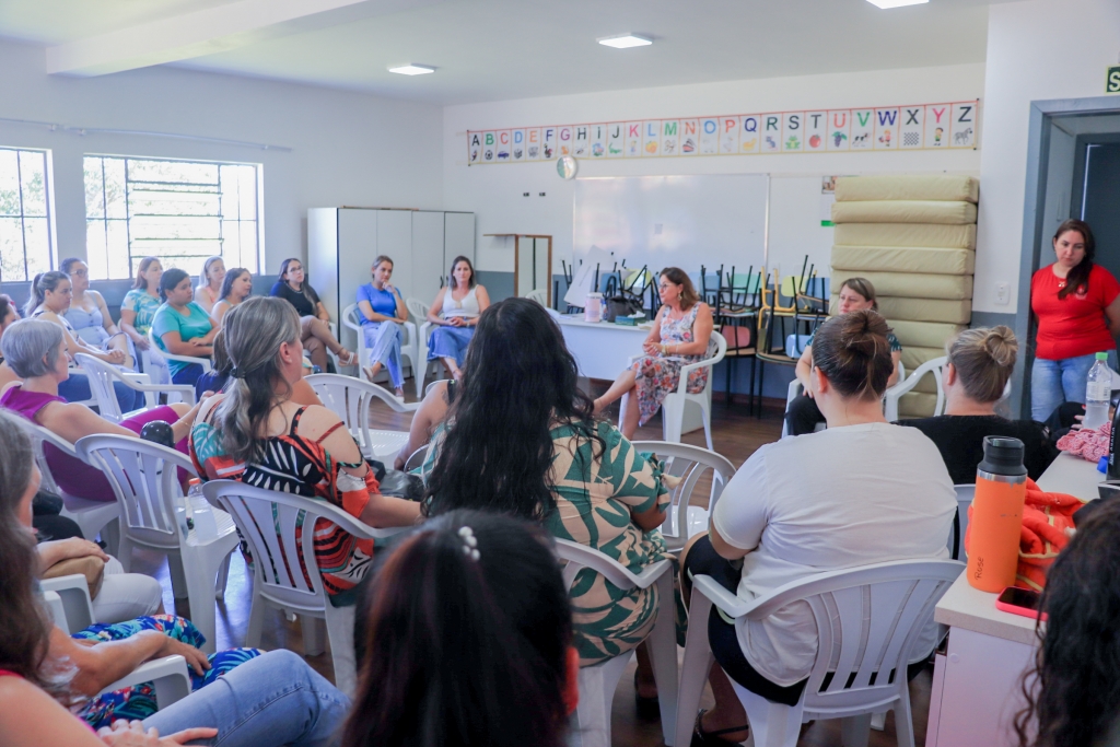 Às 10h, na EMEI "A Sementinha", foi a vez das Auxiliares de Ensino serem recepcionadas. O encontro serviu para reforçar a importância do trabalho em equipe e alinhar diretrizes pedagógicas e organizacionais para o ano letivo.