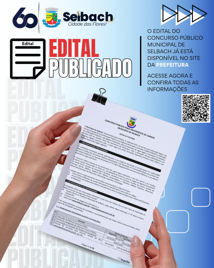 A Prefeitura Municipal de Selbach informa que já está disponível o edital do Concurso Público Municipal, destinado ao provimento de vagas e à formação de cadastro reserva para diversos cargos do quadro de servidores do município.