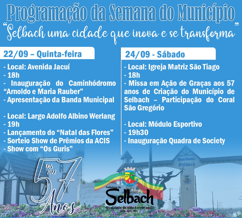 A Administração Municipal está divulgando a programação completa da Semana do Município. De 16 a 24 de setembro, Selbach terá várias atividades em comemoração aos seus 57 anos de emancipação.