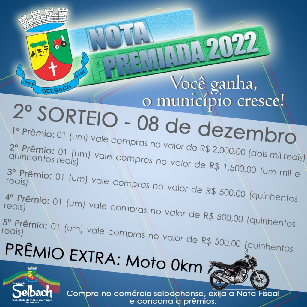 Acontece na noite desta quinta-feira, 08 de dezembro, o segundo e último sorteio da Nota Premiada 2022, que distribuirá R$ 5 mil vale compras, divididos em 5 prêmios: R$ 2 mil para o 1º, o 2º ganhará R$ 1.500 e o 3º, 4º e 5º serão comtemplados com R$ 500 cada, e uma MOTO ZERO KM como prêmio extra.