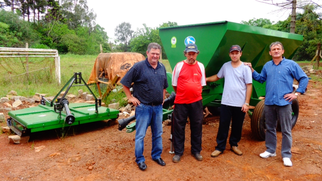 Foram entregues nesta manhã (16) para Prefeitura municipal, uma esterqueira, uma calcariadeira e uma roçadeira, todos adquiridos no processo licitatório e que fazem parte dos equipamentos para patrulha agrícola, sendo que a mesma já possui 2 tratores, 1 roçadeira,1 plantadeira para culturas de inverno e verão, 1 carreta agrícola, 1 broca. Pede-se para que seja feita a reserva para usufruir dos equipamentos junto a Secretaria de Agricultura. Foto: Prefeito Sergio, Secretário Claudir, Coordenador Boneimar e Servidor Gilmar.