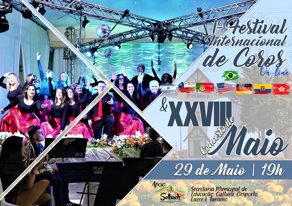 No próximo sábado (29), às 19h, acontece 1º Festival Internacional de Coros On-line e XXVIII Concerto de Maio. Este ano, além da apresentação Coral Municipal São Gregório, o evento contará com a participação de coros de outros sete países. Ele será totalmente on-line, e poderá ser acompanhado através da página do Facebook da Prefeitura de Selbach, https://www.facebook.com/events/582035452768227?ref=newsfeed ou através do Youtube, https://youtu.be/EkGAVVbeWHA.