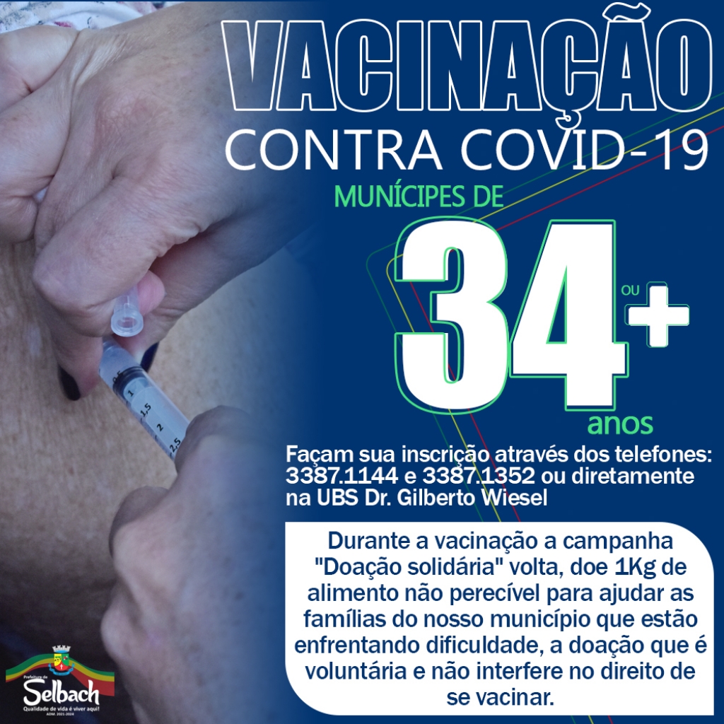 Começa o agendamento para imunização com a primeira dose da vacina contra a COVID-19 para os munícipes com 34 anos ou mais, e segue para os demais grupos prioritários que ainda não a receberam.