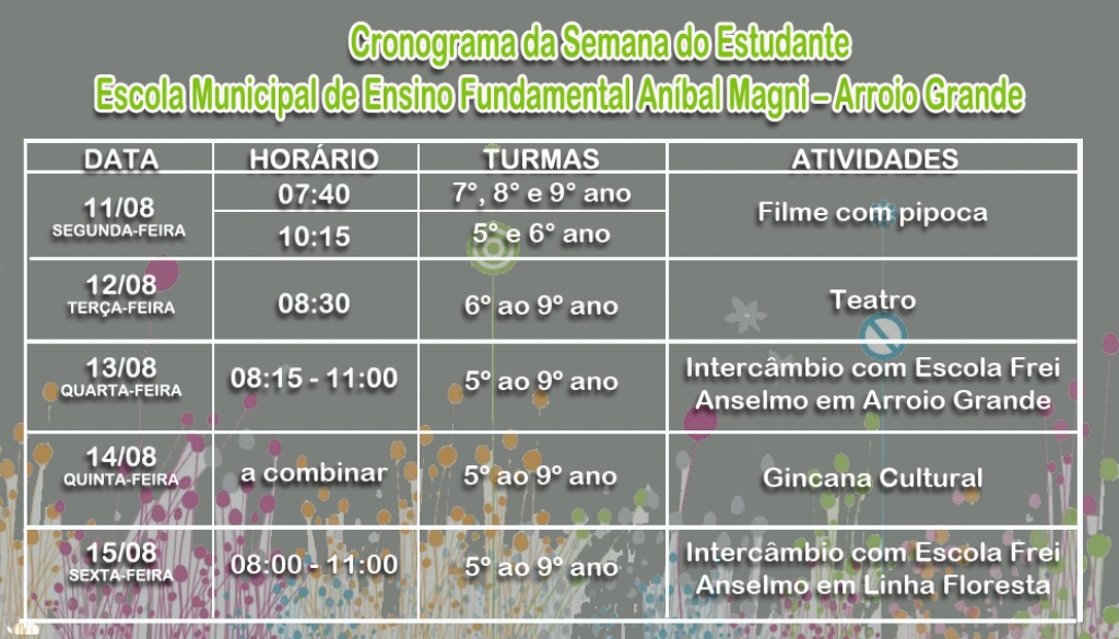 Cronograma de Atividades da Semana do Estudante da Escola Aníbal Magni